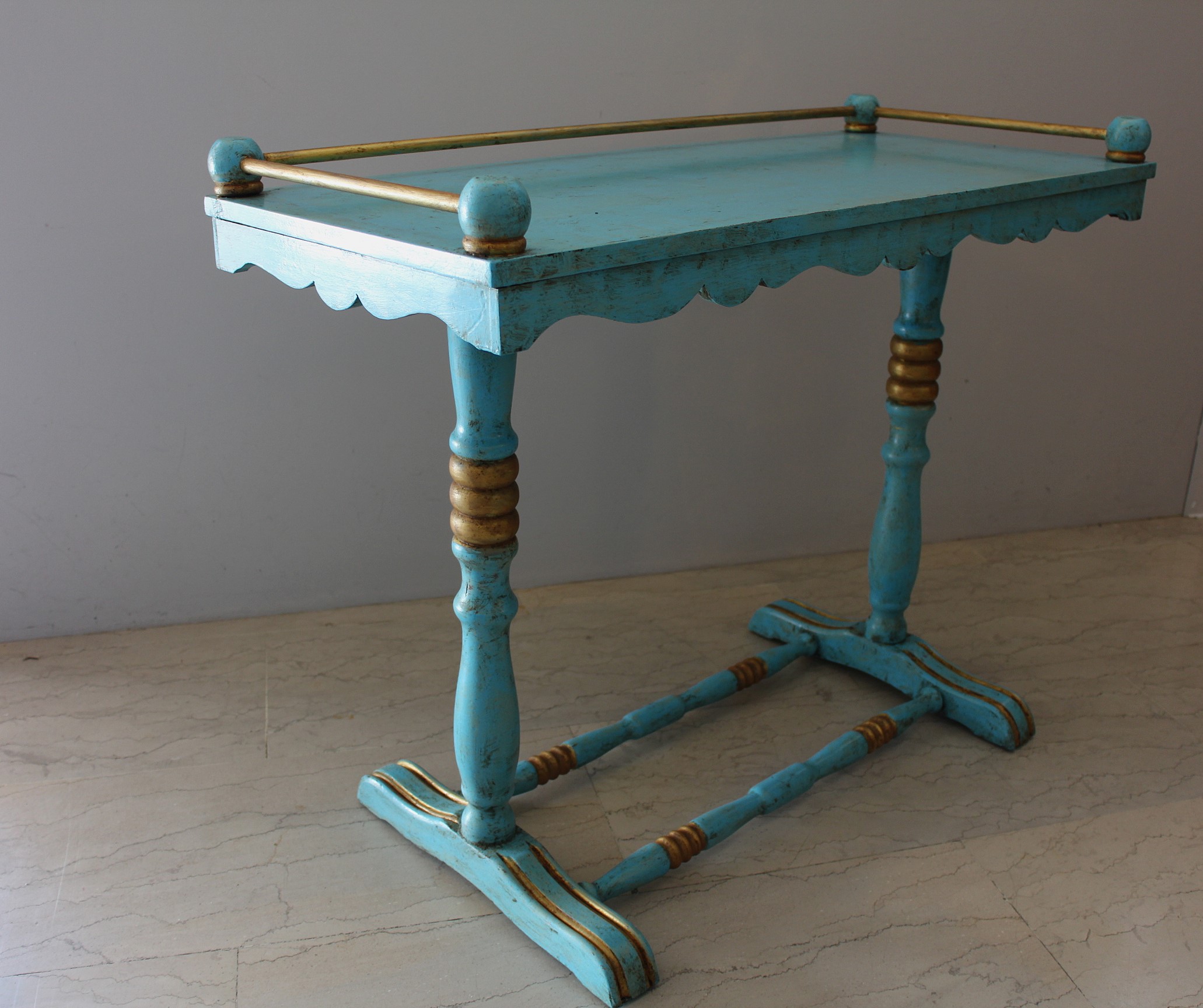 Σετ τραπέζι με 2 καρέκλες σε έντονη γαλάζια πατίνα με χρυσό στις λεπτομέρειες. Το τραπεζάκι έχει μεταλλικό ”κάγκελο” και οι καρέκλες ντυμένες με ανάγλυφο βελούδο, Γαλλία 1920.